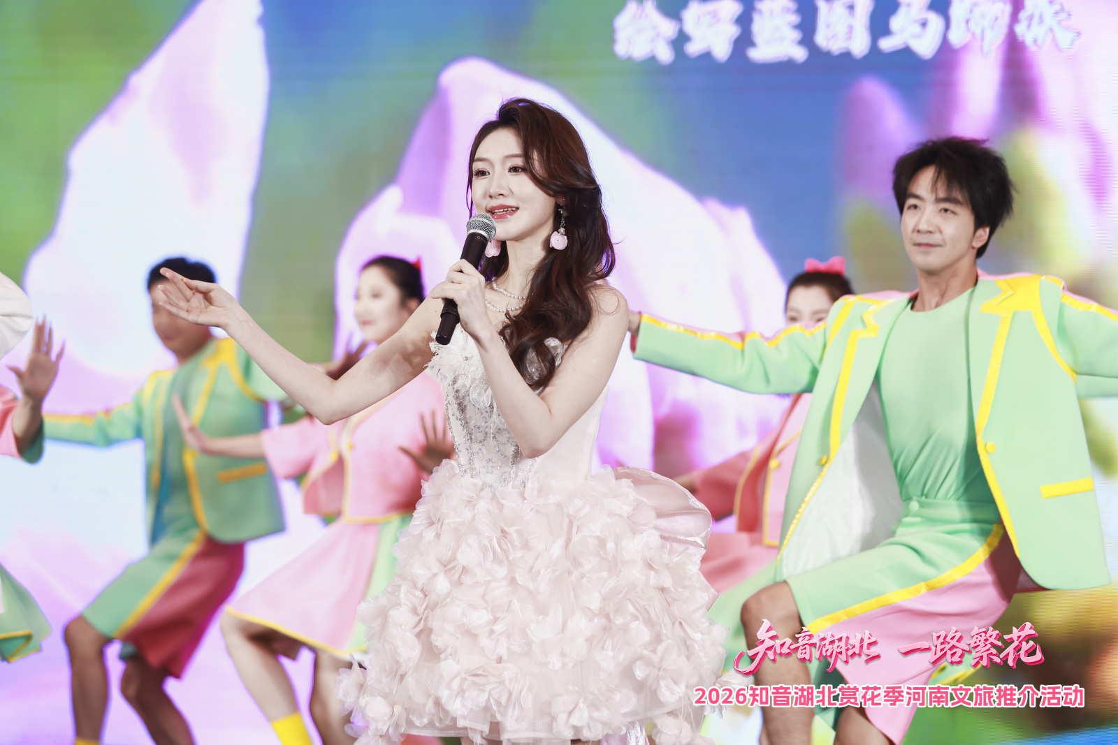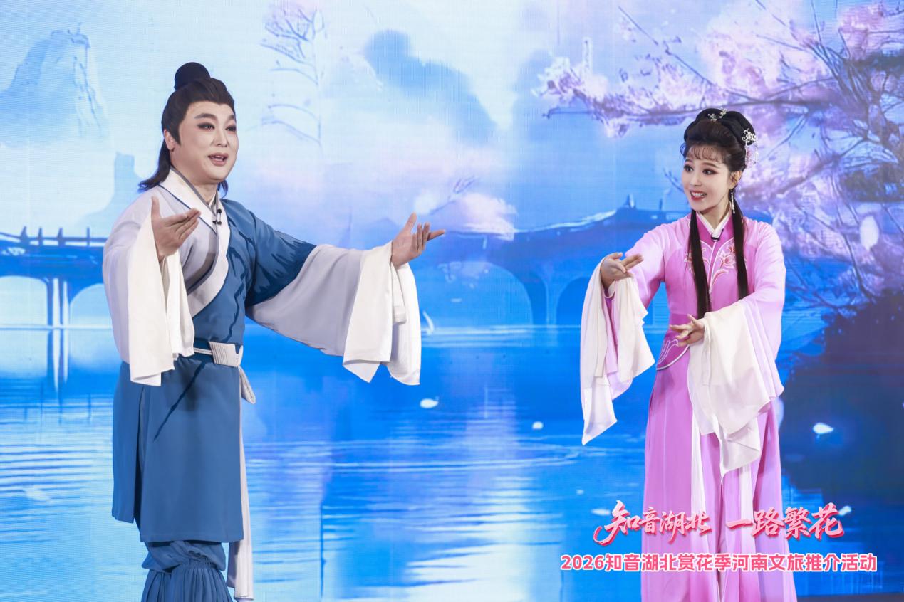 活动现场氛围热烈,荆楚特色展演率先点燃全场热情。“十二花神”惊艳亮相,以灵动舞姿演绎春日花语,瞬间成为现场焦点;资深媒体人、中国摄影家协会会员雷刚以分享式推介《风雨七十载,一路竞繁花》,讲述他眼中湖北的春天;在稚嫩童声清唱《春天在哪里》、地道武汉伢柳力文吉他弹唱《花心》后,现场还向河南观众赠送湖北带来的百花种子;两地联袂戏曲表演《百花争春·戏韵天长》中,湖北黄梅戏的婉转与河南豫剧的铿锵交织,唱出豫鄂情深。沉浸式光影效果与特色文艺演出深度融合,让现场观众直观感受到了“知音湖北”春日文化底蕴与浪漫风情。
