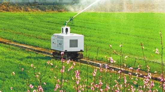 3月27日,商丘市睢县城关镇袁庄村的一处麦田,智能灌溉机器人正在进行水肥一体化喷灌作业。豫东平原上,各类农机轰鸣穿梭、高效作业,一幅幅抢抓农时、精细管护的春管实景图徐徐铺展。 徐泽源 摄