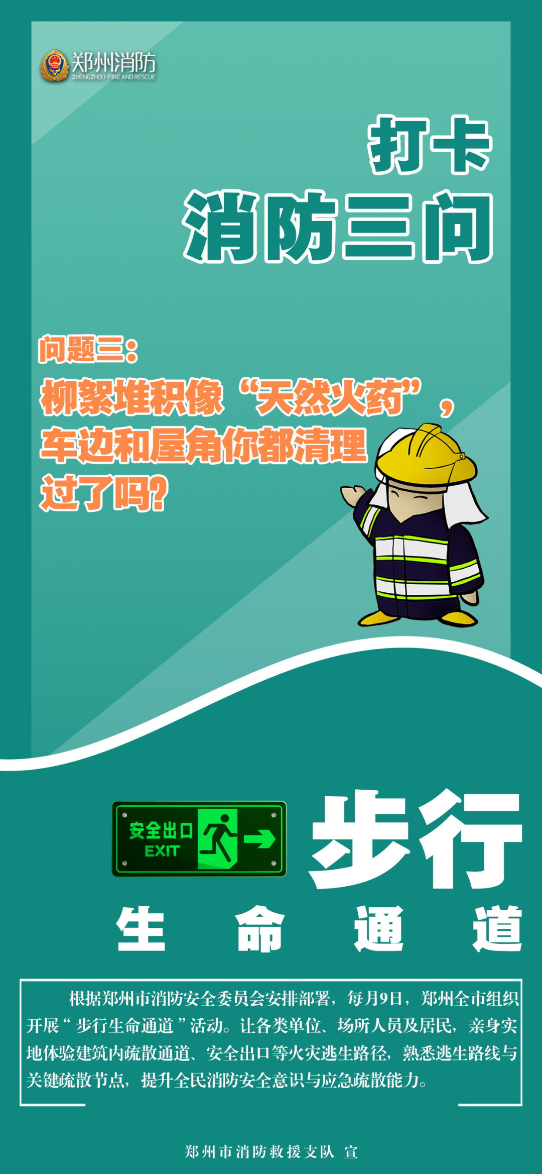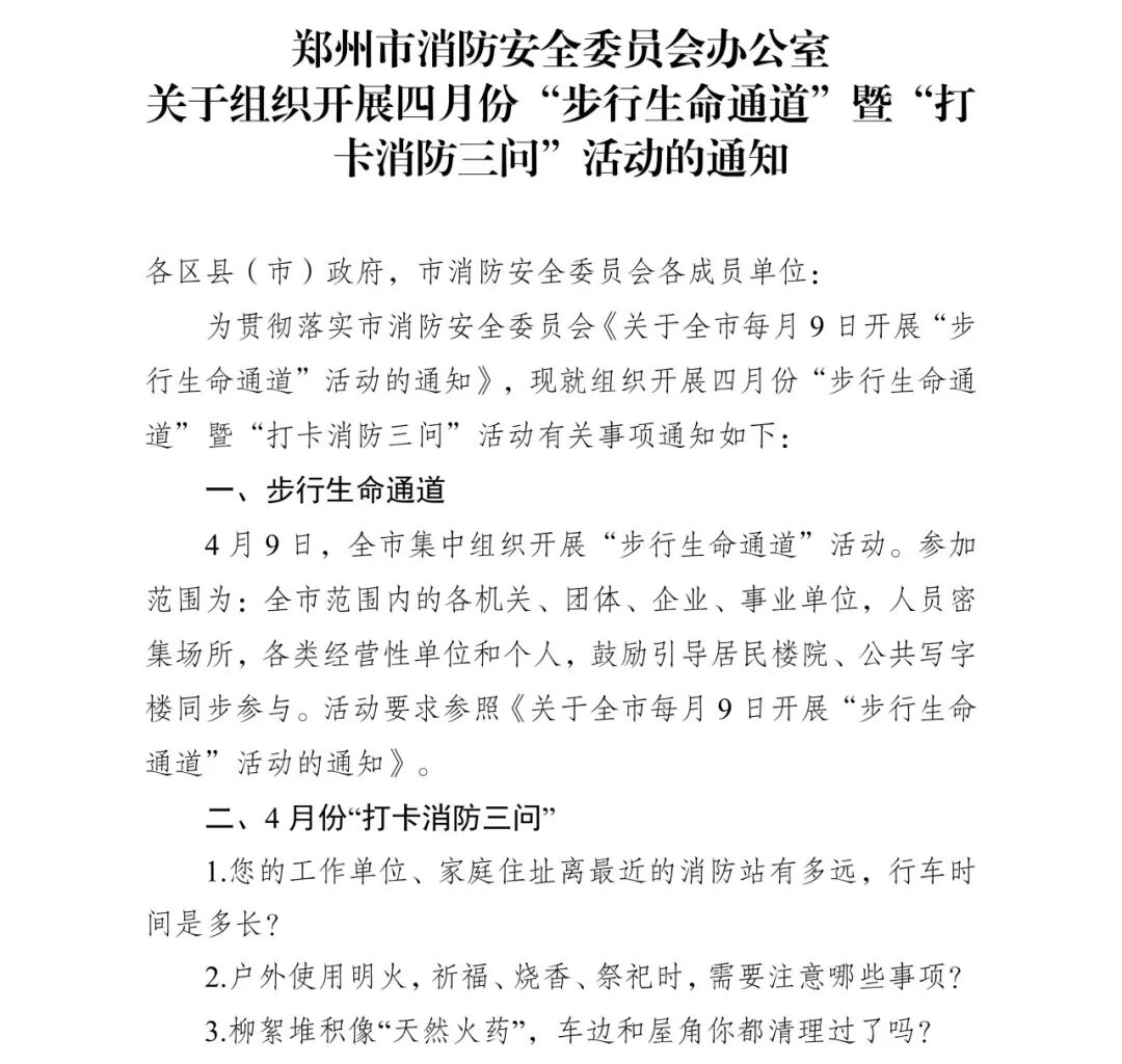 郑州全市继续开展4月份“步行生命通道”暨“打卡消防三问”活动