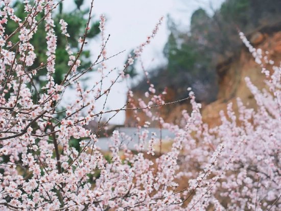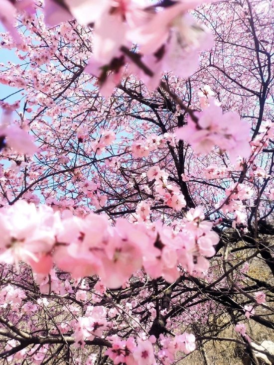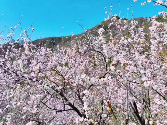 秋沟的野生山桃花漫山绽放,粉色花海铺满山谷,勾勒出太行最美春日画卷。