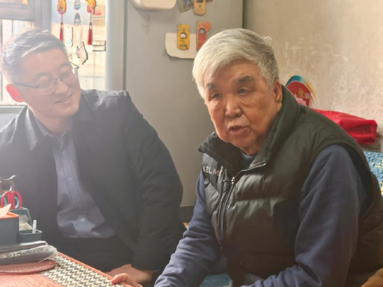 田磊一行与老人亲切交谈,细致询问其身体状况、生活起居及实际需求,并送上精心准备的慰问品。