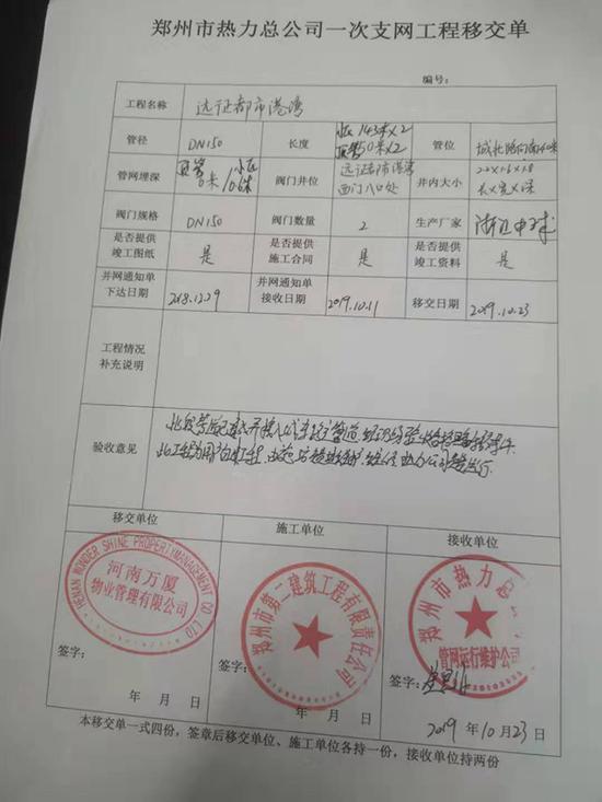 当天下午,记者在位于小区所属的河南万厦物业管理有限公司远征都市港湾管理处了解情况,工作人员向记者出示了一份“郑州市热力总公司一次支网工程移交单”,称小区供暖问题一直在进行积极沟通,所有的相关资料都已提交审核。记者在移交单上看到,并网通知单下达日期签字为2018年12月29日,并网通知单接收日期为2019年10月11日,移交日期为2019年10月23日。