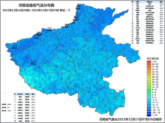 12月16日20时-12月17日7时,全省大部最低气温在零下2℃以下,其中西部、北部及商丘等地有120个县(市、区)809站最低气温在零下5℃以下,西部山区局部低于零下10℃,最低气温前三位分别为:绳池县韶山零下16.7℃、辉县市关山零下16.3℃、栾川县老君山零下15.9℃。