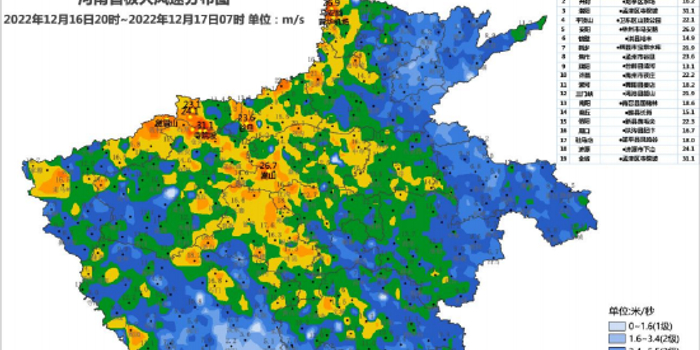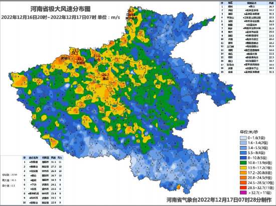 记者从河南省气象局获悉,12月16日20时-12月17日7时,受强冷空气影响,我省自西北向东南出现5级左右西北风,其中洛阳、焦作、济源、安阳、郑州等13个地市的部分县市共118站出现8级以上大风,风速前三分别为:洛阳市寺院坡31.1米/秒(11级)、新安县鹰嘴山27.2米/秒(10级)、林州市马安脑26.9米/秒(10级)。郑州有11站出现8级以上大风,分布在巩义、登封、荥阳、金水区、中牟等地,登封市徐庄镇最大26.6米/秒(10级)。