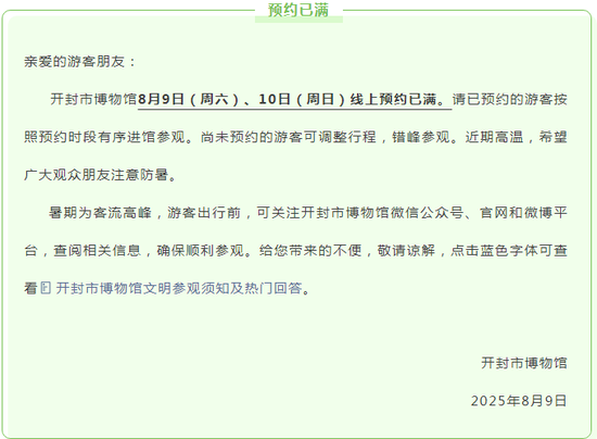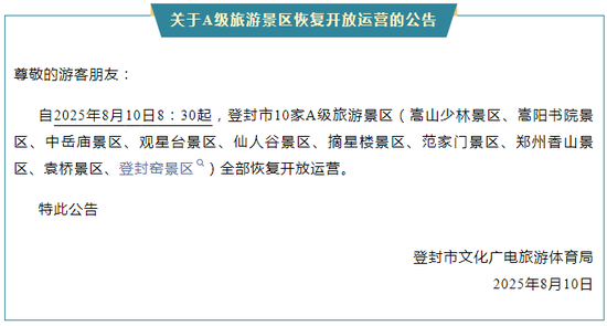 8月10日,记者从多家场馆获悉,郑州商城东城垣遗址博物馆于2025年8月10日(星期日)下午13:00闭馆,8月12日(星期二)恢复正常开放;登封市10家A级旅游景区自2025年8月10日8:30起全部恢复开放运营;开封市博物馆今日(周日)线上预约已满。请已预约的游客按预约时段有序进馆参观,尚未预约的游客建议调整行程、错峰前往。