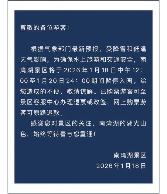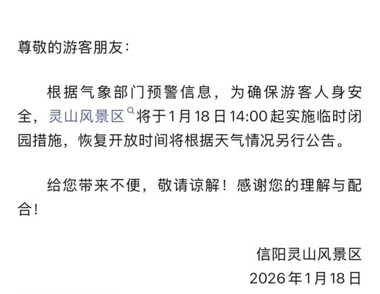 自[2026年1月18日9时]起,景区将临时关闭,暂停接待游客,恢复开放时间将根据天气情况及安全隐患排查结果另行通知。