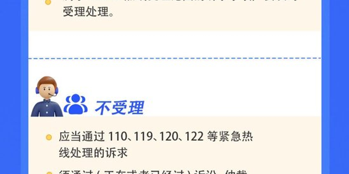《通知》要求分类处理规范热线诉求受理,对属于12345热线受理范围的诉求事项要及时受理处理,严格规范话务接听服务,规范用语、热情解答、文明服务。对于属于110、119、120、122等紧急类的,即时联动转交各平台处置;对于须通过或者已进入诉讼、仲裁等其他法定途径解决的,告知相应法定途径;对于调解类诉求,承办单位多次调解无实质性进展,并已建议通过司法途径维权的,不再受理;对于无相关新证据材料,已经依法依规处理再次提出的诉求事项,不再受理。
