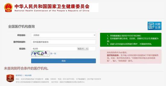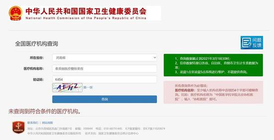 4月1日,记者曾通过国家卫健委官网的全国医疗机构查询,在名称一栏输入两个门面牌匾的“郑州眼鼻修复基地”和“泰美丽医疗整形美容”,查询结果显示未查询到符合条件的医疗机构。