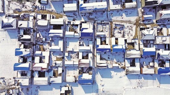 借助无人机从空中俯瞰,雪后初霁的平原大地宽广辽阔,一座座村庄散落其间,四周是洁白苍茫的麦田,大自然匠心独运绘就了一幅水墨画卷。