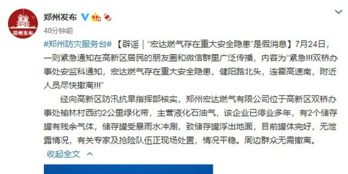 经向高新区防汛抗旱指挥部核实,郑州宏达燃气有限公司位于高新区双桥办事处榆林村西约2公里绿化带,主营液化石油气,该企业已停业多年,有2个储存罐有残余气体,储存罐受暴雨水冲涮,致储存罐浮出地面,目前罐体完好,无泄露情况,有关专家及抢险队伍正现场处置,情况平稳。周边群众无需撤离。