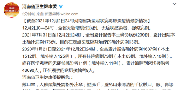 [截至2021年12月2日24时河南省新型冠状病毒肺炎疫情最新情况]