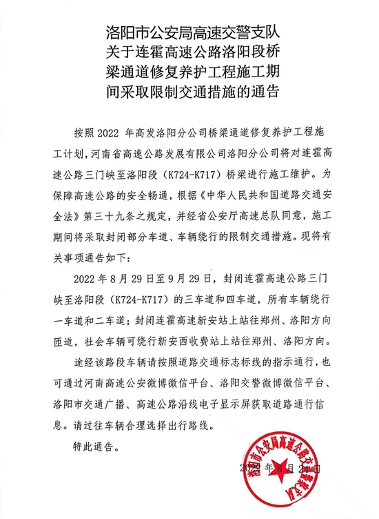 2022年8月29日至9月29日,封闭连霍高速三门峡至洛阳段(K724-K717)的三车道和四车道,所有车辆绕行一车道和二车道;封闭连霍高速新安站上站往郑州、洛阳方向匝道,社会车辆可绕行新安西收费站上站往郑州、洛阳方向。途经该路段的车辆,请按照道路交通标志标线指示,有序通行。
