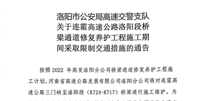 8月27日,记者从洛阳高速交警支队了解到,连霍高速三门峡至洛阳段(K724-K717)将进行桥梁施工维护。施工期间将采取封闭部分车道、车辆绕行的限制交通措施。具体信息如下: