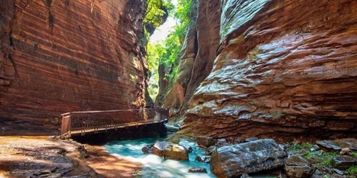 龙潭大峡谷内红岩绝壁奇秀壮观,飞瀑成群,清泉叮咚,移步换景,关峡相望,峡秀谷幽,经过十二亿年的地质沉积和260万年的水流切割旋蚀,形成的“山崩地裂”奇观堪称世界一绝。