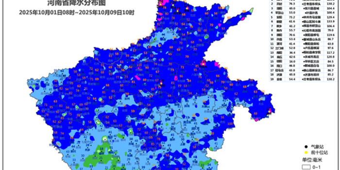 图1 2025年10月1日8时至9日9时河南省降水分布图