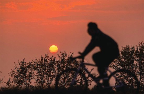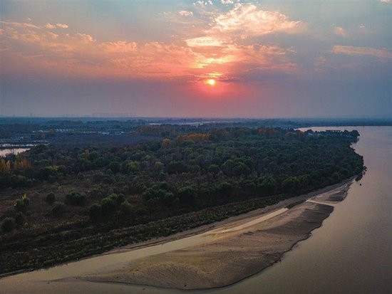 在落日余晖下,郑州黄河滩地公园的万亩林海层林尽染、美不胜收,构成一幅绝美的母亲河画卷。