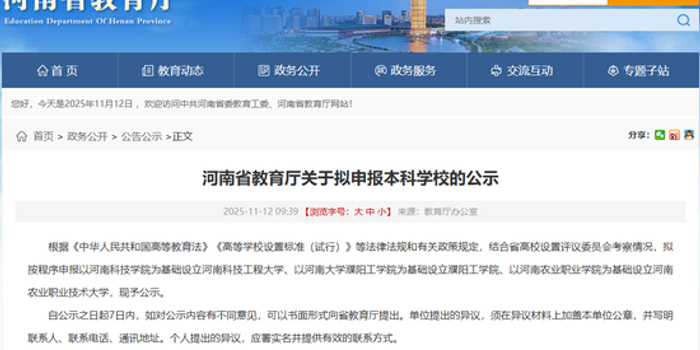 关注[大河财立方消息]11月12日,河南省教育厅公示,拟按程序申报本科学校,包括以河南科技学院为基础设立河南科技工程大学、以河南大学濮阳工学院为基础设立濮阳工学院、以河南农业职业学院为基础设立河南农业职业技术大学。