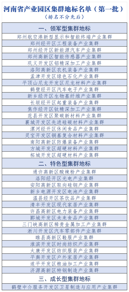 关注大河网讯 12月1日,记者从省发展改革委获悉,河南省第一批36个产业园区集群地标名单进入公示阶段,公示期为2025年12月1日至2025年12月5日。地标名单共分为三个类型,分别是由郑州航空港新型显示和智能终端产业集群等构成的领军型集群地标,由通许高新区酸辣粉产业集群等构成的特色型集群地标,以及由鹤壁中介服务开发区卫星制造与应用产业集群构成的成长型集群地标。