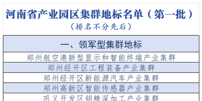 据了解,为贯彻落实省委、省政府关于产业园区改革发展的部署要求,做大做强产业园区主导产业,提升产业园区专业化、特色化、集群化发展水平,打造一批更具辨识度和影响力的产业集群地标,经省辖市研究梳理、第三方评估,形成了第一批特色突出、协作高效、品牌效应凸显、场景资源丰富的标志性产业园区集群。