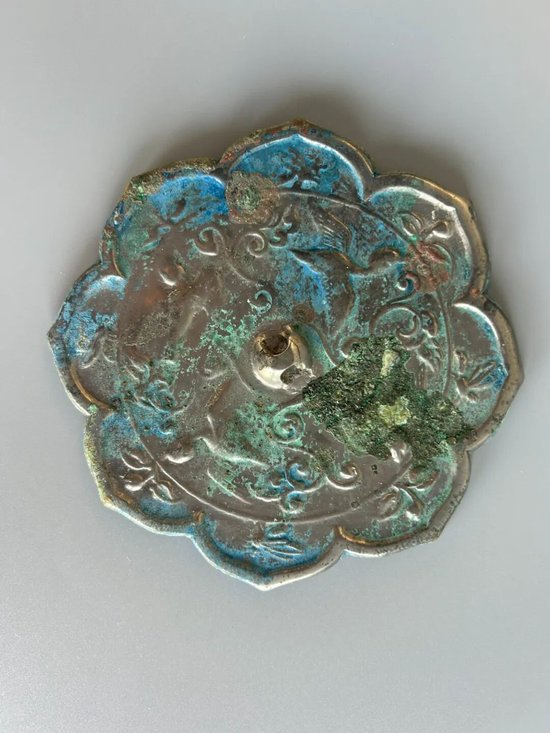 铜镜呈八瓣菱花形,内切圆形,圆纽,纽周边饰鸟纹与花枝纹,缘内蜜蜂、花叶相间排列;铜簪呈“U”形,由一根铜丝弯折而成,簪体的横截面为圆形;铜指环保存较好,部分有锈蚀,圆环状,横截面近圆形,素面;铜戒指保存较差,锈蚀较严重,圈底一侧已经残损,戒面较宽、有1.2厘米,径长约1.7厘米。