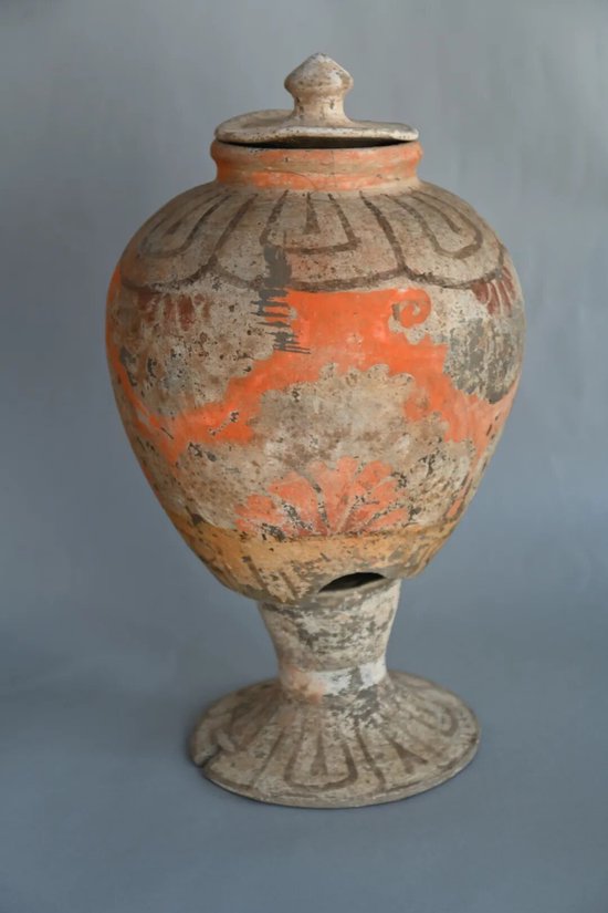其中,唐代塔形罐出土于该考古工地M5墓室的西北部,由器盖、罐、底座三部分组成。盖沿微上翘,盖下面为突出的短子口,顶部有宝珠形纽。罐圆唇,溜肩鼓腹,腹下部斜收,平底。底座呈束腰喇叭状,上部为平顶,下部外撇。器表均施一层白色陶衣,然后在其上彩绘,彩绘部分脱落,残留有黑彩、朱红彩和橘黄色彩绘。