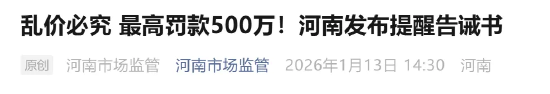 为进一步规范全省大规模设备更新和消费品以旧换新活动市场价格秩序,1月13日,河南省市场监管局发布提醒告诫书。