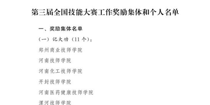 关注大河网讯 近日,河南省人民政府发布《关于奖励第三届全国技能大赛工作中作出突出贡献集体和个人的决定》(以下简称《决定》),给予为第三届全国技能大赛作出突出贡献的郑州商业技师学院等11个集体记大功,省委办公厅秘书处等14个集体、王龙等52名同志记三等功,中国空空导弹研究院等35个集体、丁惠平等49名同志记功,省政府办公厅一处等109个集体、马林等197名同志嘉奖。