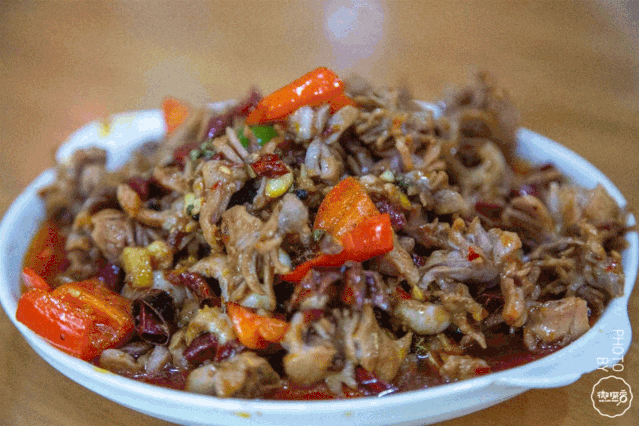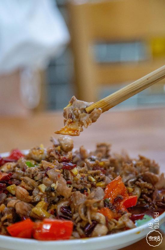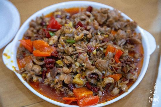 满满一大盘经过麻椒、花椒和辣椒爆炒后的鸡胗,